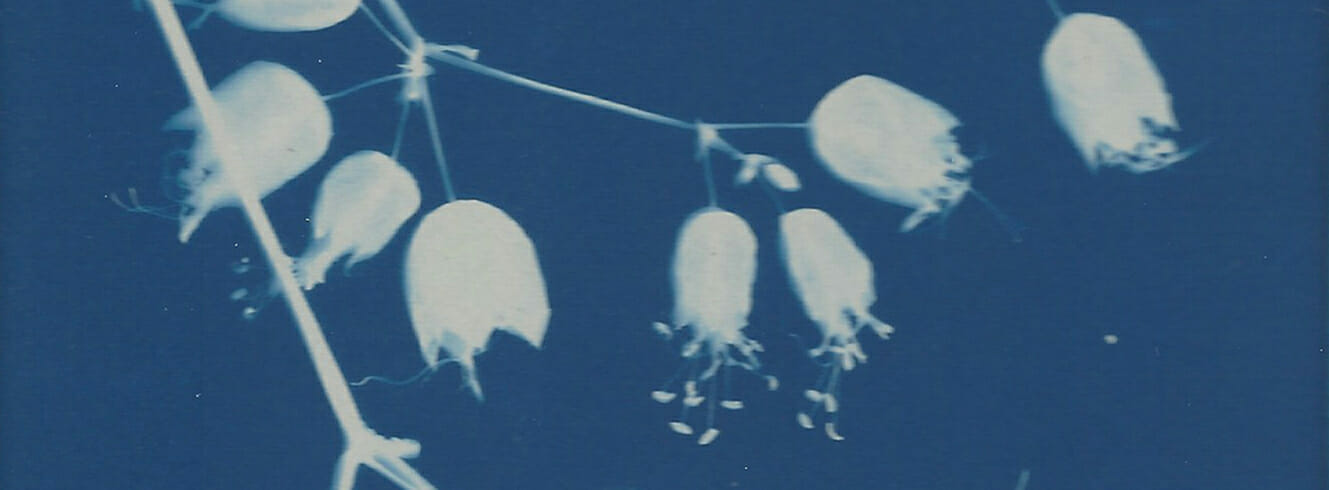 Bertha Jaques was already a respected printmaker when she began making cyanotype photograms of wildflowers. An active member of the Wild Flower Preservation Society, she created over a thousand of these botanical images. These were made without a camera by placing objects directly on sensitized paper and exposing it to light, the photogram is the least industrialized type of photography. Because prints were easy to create by this method, it became widely popular. Graphic artists often chose this form of print because of its rich Prussian blue color. Aligned with the antimodernist views of the late Victorian Arts and Crafts movement, Jaques’s work reflects a reverence for commonplace elements of nature and the beautifully crafted object.