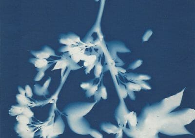 Bertha Jaques was already a respected printmaker when she began making cyanotype photograms of wildflowers. An active member of the Wild Flower Preservation Society, she created over a thousand of these botanical images. These were made without a camera by placing objects directly on sensitized paper and exposing it to light, the photogram is the least industrialized type of photography. Because prints were easy to create by this method, it became widely popular. Graphic artists often chose this form of print because of its rich Prussian blue color. Aligned with the antimodernist views of the late Victorian Arts and Crafts movement, Jaques’s work reflects a reverence for commonplace elements of nature and the beautifully crafted object.